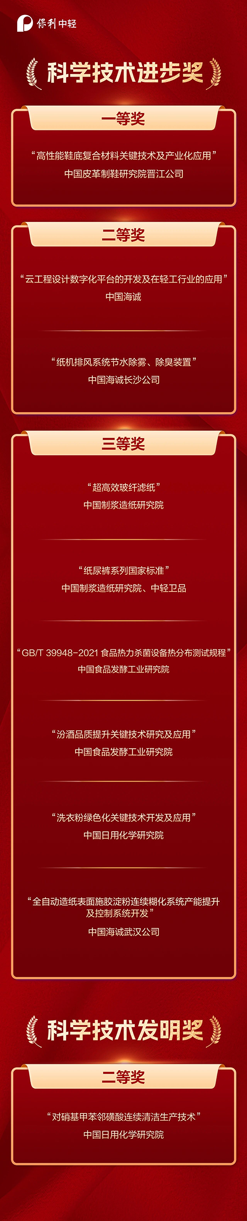 近日,“2024年中國輕工業(yè)聯(lián)合會科學(xué)技術(shù)獎”評選結(jié)果正式揭曉。保利中輕榮獲中國輕工業(yè)聯(lián)合會科學(xué)技術(shù)進(jìn)步獎一等獎1項(xiàng)、二等獎2項(xiàng)、三等獎6項(xiàng),科學(xué)技術(shù)發(fā)明獎二等獎1項(xiàng)。