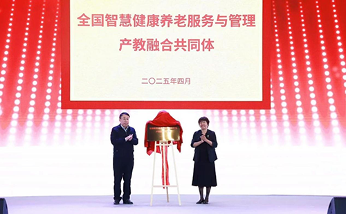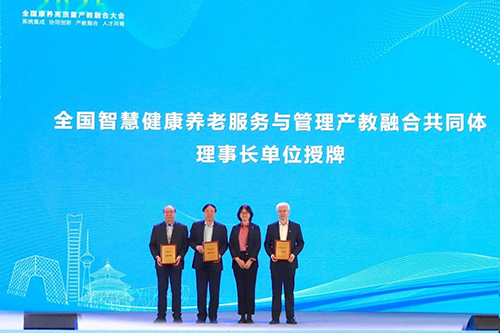 北京市教委二級(jí)巡視員楊江林、北京市民政局二級(jí)巡視員白玲為“全國(guó)智慧健康養(yǎng)老服務(wù)與管理產(chǎn)教融合共同體”揭牌。